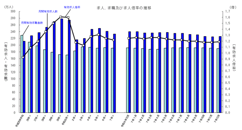 - 令和7年平均の有効求人倍率:1.22倍(前年比0.03ポイント低下)